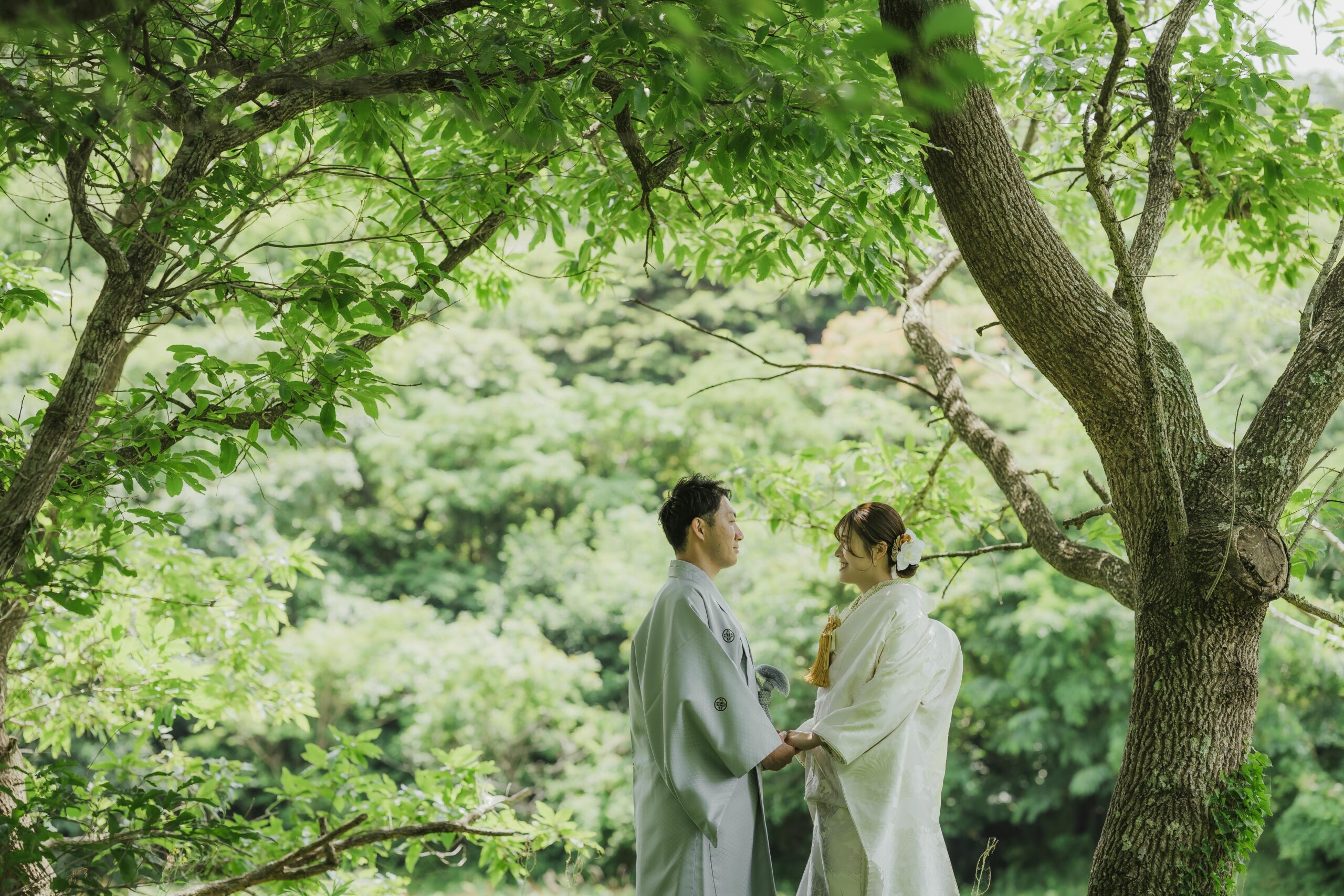 - 森の中でナチュラルフォト。木漏れ日がふたりを包む